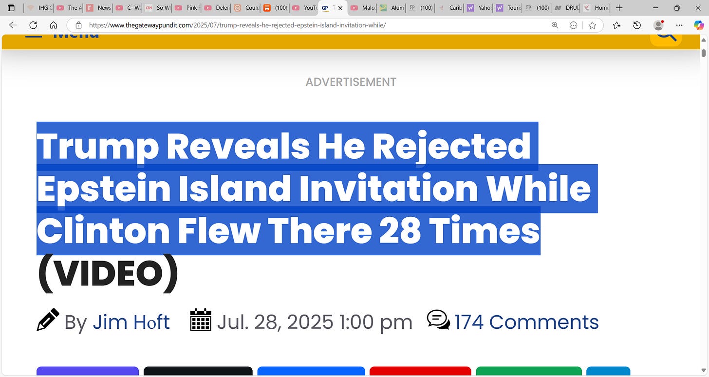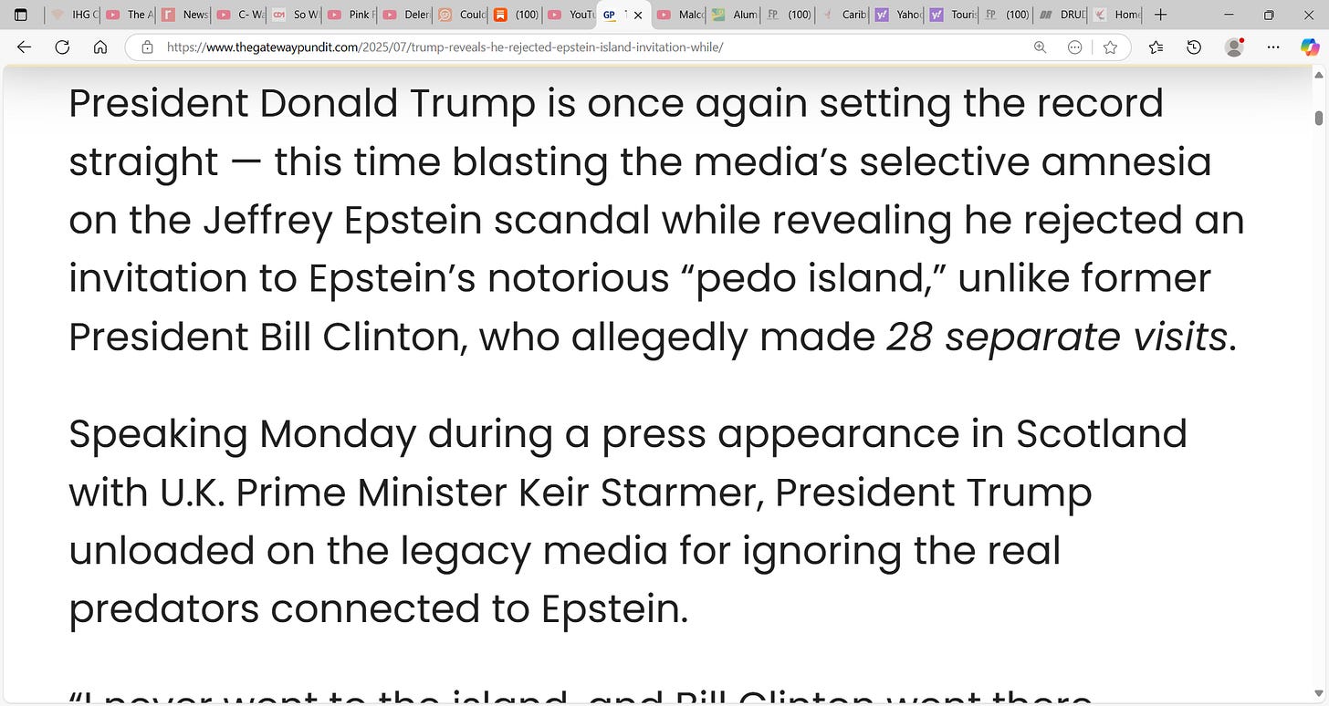 ‘President Donald Trump is once again setting the record straight — this time blasting the media’s selective amnesia on the Jeffrey Epstein scandal while revealing he rejected an invitation to Epstein’s notorious “pedo island,” unlike former President Bill Clinton, who allegedly made 28 separate visits.