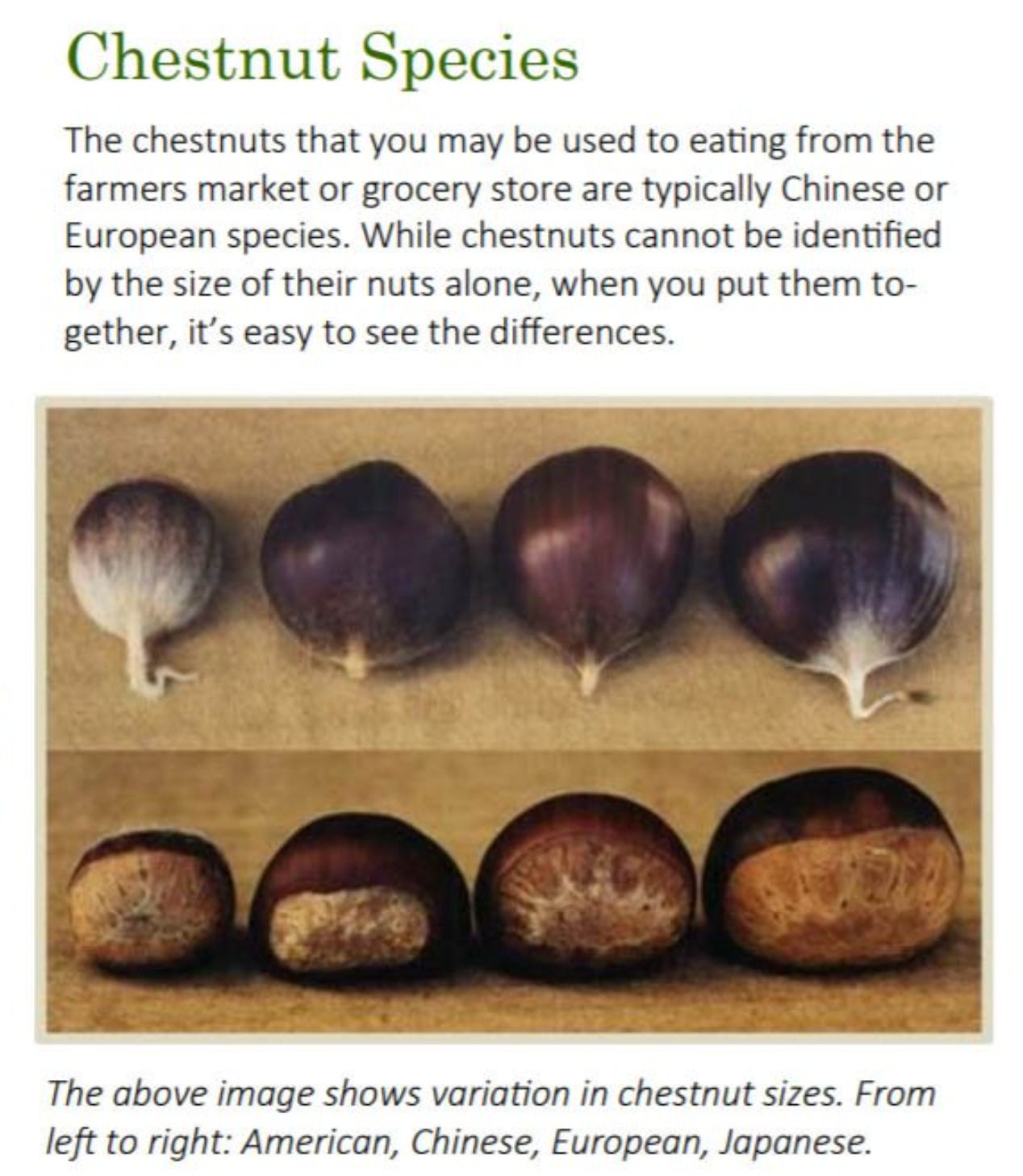 For those interested, below is a chart comparing the leaves of the various chestnuts, followed by a chart comparing the nuts (the American nut is considered sweeter, but the Chinese has a larger nut, which is easier to harvest).