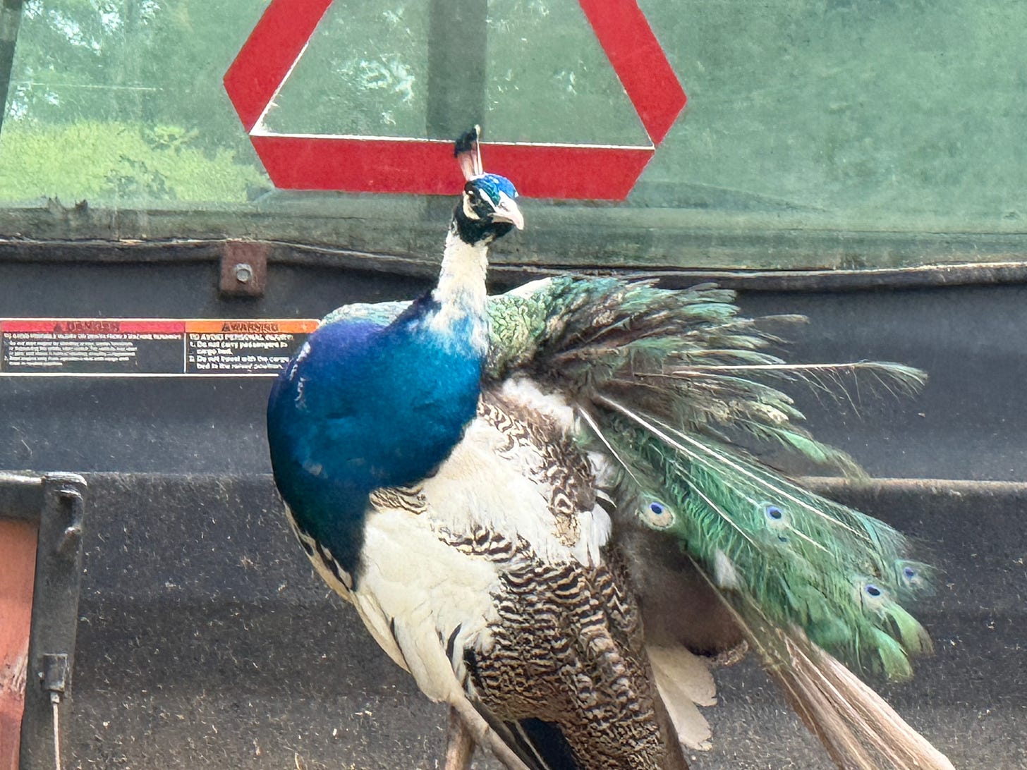 Well, we armed ourselves with our trusty manure folks (soft-tongued rakes) and hopped in the trusty Kubota RTV – which doubles as a Peacock roosting device, when not in use by humans….